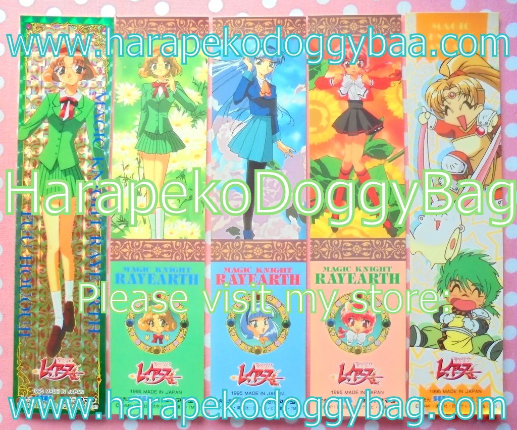 BOOKMARK STICKER SET CONDITION: The Magic Knight Rayearth stickers are in medium good condition. There is handling wear. The sticker color has changed over time. The backing paper on the back of each sticker has yellowed from age. Some stickers are creased on the corners. The stickers curve slightly.