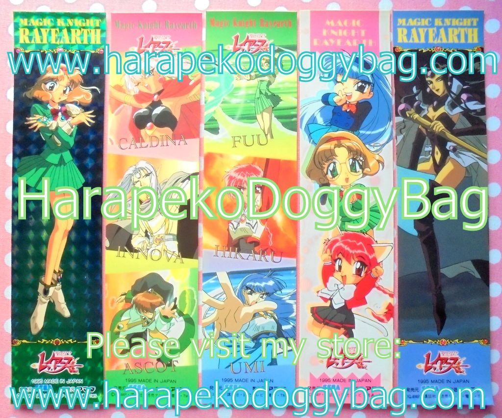 BOOKMARK STICKER SET CONDITION: The Magic Knight Rayearth stickers are in medium good condition. There is handling wear. The sticker color has changed over time. The backing paper on the back of each sticker has yellowed from age. Some stickers are creased on the corners. The stickers curve slightly.