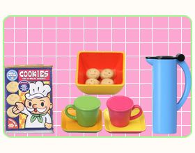 Keywords: Megahouse, Mini Collection, Japanese Toys, Miniatures, Miniature, Dollhouse, Doll House, Puchi, Mini, Pop'n Kitchen Tools, Miniature Smiling Tea Set & Cookie Box, 2007.