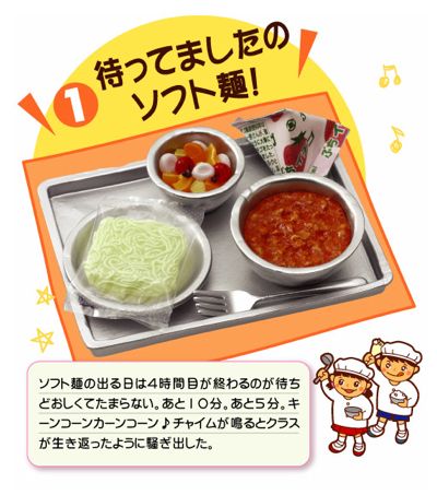 Re-ment Miniatures : Everybody Let's Eat Together! (2007) #1 - Miniature School Lunch Meal / Noodles & Fruit Salad Punch