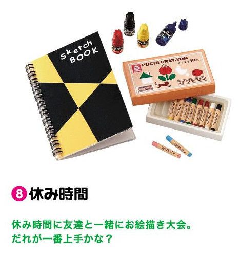 Keywords: Re-ment, Rement, Japanese Toys, Miniatures, Miniature, Dollhouse, Doll House, Puchi, Mini, Created With Love in Japan, Puchi Petite Sample Series, Favorite Stationery, Miniature Art Sketchbook & Color Crayons, 2006.