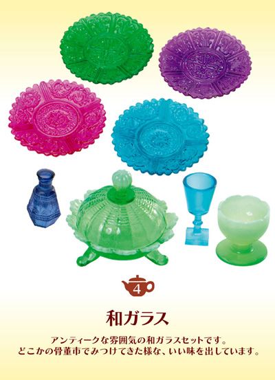 Keywords: Re-ment, Rement, Japanese Toys, Miniatures, Miniature, Dollhouse, Doll House, Puchi, Mini, Created With Love in Japan, Puchi Petite Sample Series, Puchi Petite Collection, Dream Tableware Collection, Miniature Antique Japanese Glassware, 2005.