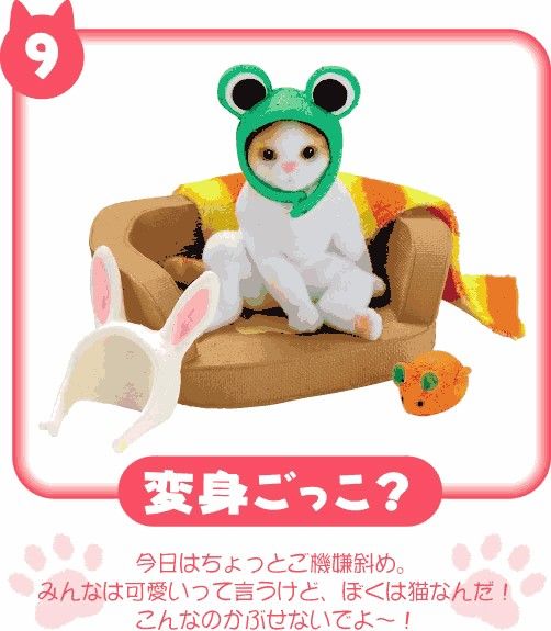 Keywords: Re-ment, Rement, Japanese Toys, Miniatures, Dollhouse, Doll House, Puchi, Mini, Kawaii, Cute, Cat Diary, Sitting Cat, Frog Hat, Rabbit Hat, Cat Sofa, Blanket, Toy Mouse.