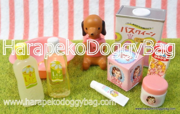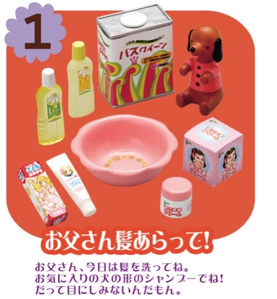 Keywords: Re-ment, Rement, Japanese Toys, Miniatures, Dollhouse, Doll House, Puchi, Mini, Kawaii, Cute, Retro Girly Treasures, Showa Period, Nostalgic, Bathroom, Shampoo Bottle, Dog Figure, Bath Salts, Sento Bucket, Toothpaste.