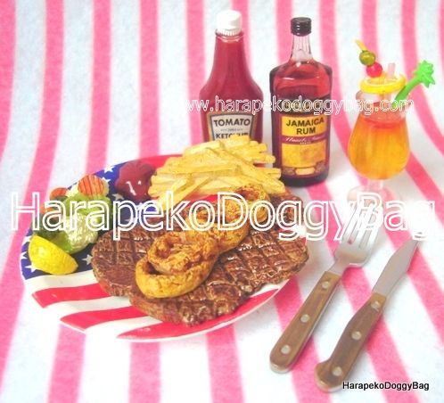 Keywords: Re-ment, Rement, Japanese Toys, Miniatures, Dollhouse, Doll House, Puchi, Mini, Dreamy American Life, America, USA, Steak, Dinner, Rum, Cocktail, Cutlery, Fork, Knife, Ketchup, Tomato Sauce, Fries, Chips, Vegetables, Food, Meal, Glass, Plate.