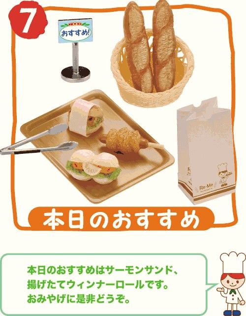 Keywords: Re-ment, Rement, Japanese Toys, Miniatures, Miniature, Dollhouse, Doll House, Puchi, Mini, Kawaii, Cute, Handmade Bread, Bakery, Food, Patisserie, Tray, Tongs, Sandwich, Baguette, Sausage Bread Stick.