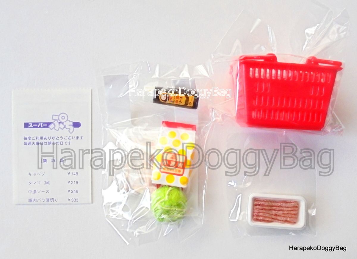 Keywords: Re-ment, Rement, Japanese Toys, Miniatures, Miniature, Dollhouse, Doll House, Puchi, Mini, Kawaii, Cute, Puchi Supermarket, Groceries, Shopping Basket, Egg Packet, Cabbage, Tonkatsu Sauce Bottle, Flour, Pork Slices, Color Variation.