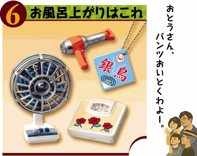 Keywords: re-ment, rement, puchi, japanese dollhouse miniatures, all, retro electrical appliances, room, oscillating fan, hairdryer, weight scale, bathroom, seventies.