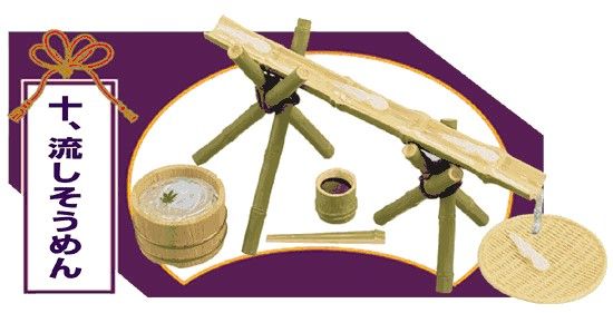 Keywords: Re-ment, Rement, Japanese Toys, Miniatures, Miniature, Dollhouse, Doll House, Puchi, Mini, Kawaii, Cute, Samurai Food, Japanese Food, Nagahi Somen Noodles, Bamboo, Tsuyu Dipping Sauce, Chopsticks, Flat Basket.