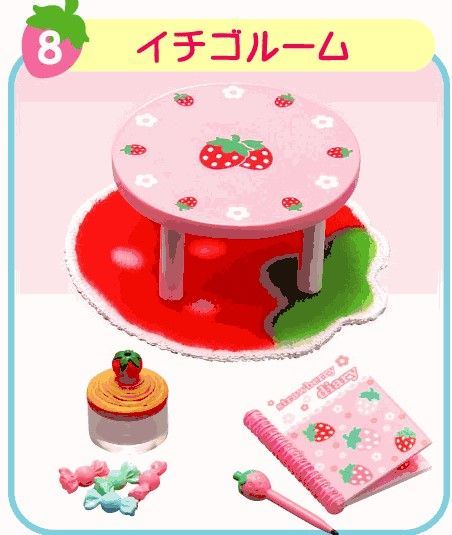 Keywords: Re-ment, Rement, Japanese Toys, Miniatures, Dollhouse, Doll House, Puchi, Mini, Welcome to My Strawberry House, Furniture, Stationery, Round Table, Diary, Book, Candy, Mat, Pen, Container, Rug.