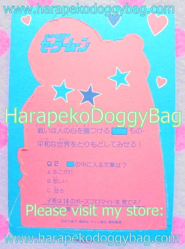SAILOR MOON CARD CONDITION : The card is in very good condition. There is some wear from handling. There are some dent marks on the front. The card has a cut-out and the thin cardboard part attached to the main card near Sailor Mercury's shirt has become detached. There are slight marks on the back from age.