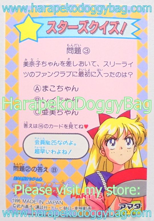 Keywords: Japanese Anime, Shojo, Shoujo, Sailor Moon, Sailor Stars, Amada Trading Card, Soft Prism Card, PP 15, Part 15, Pull Pack, 1996, Sailor Chibi Chibi Moon.