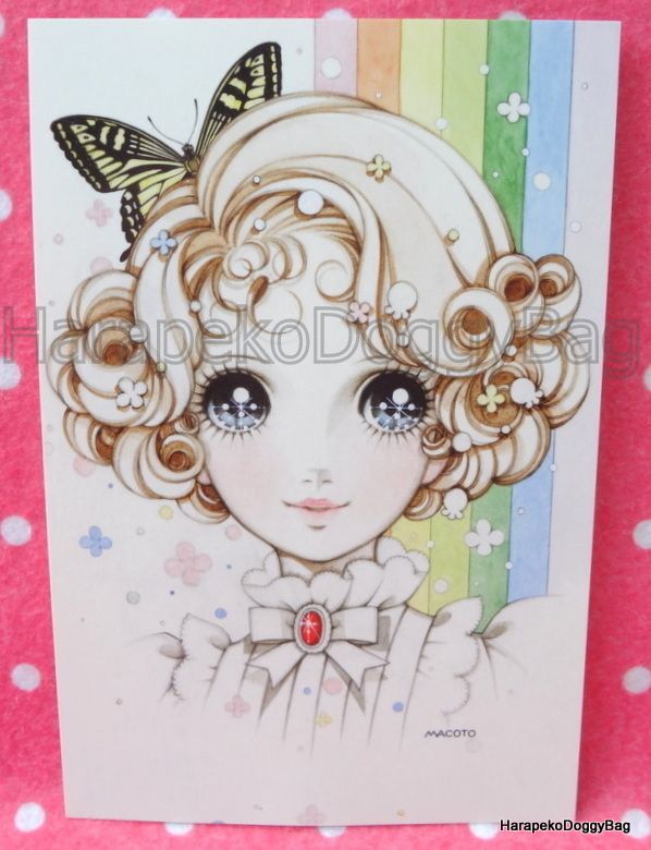 Retro, Japanese, Japan, Macoto Takahashi, Makoto, Manga Artist, Kawaii, Cute, Girl, Girly, Shojo, Shoujo, Big Eyes, Postcard, Flowers, Rainbow, Lady, 2014.