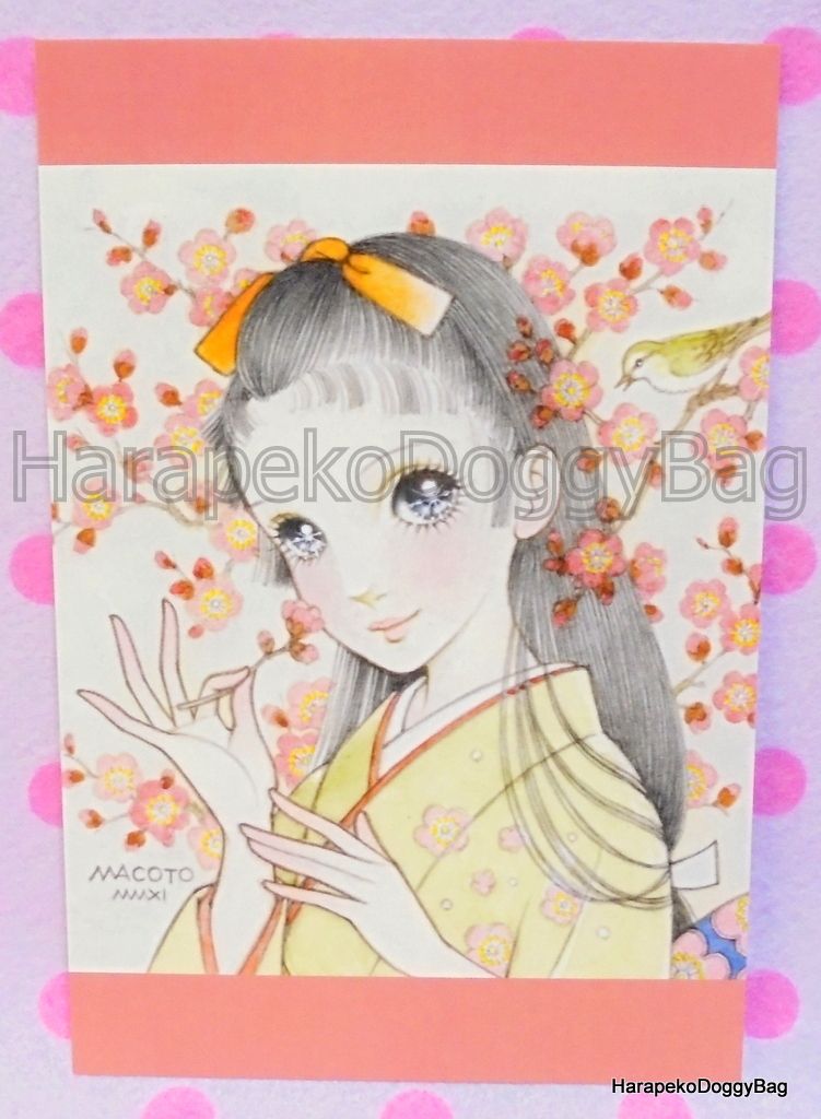 Keywords: Retro, Japanese, Japan, Macoto Takahashi, Makoto, Manga Artist, Kawaii, Cute, Girl, Girly, Shojo, Shoujo, Big Eyes, Plum Tree, Kimono, Postcard, 2018.
