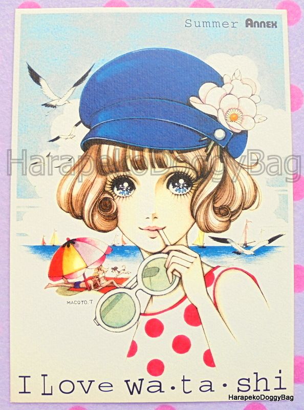 Keywords: Retro, Japanese, Japan, Macoto Takahashi, Makoto, Manga Artist, Kawaii, Cute, Girl, Girly, Shojo, Shoujo, Big Eyes, Beach, Summer, Postcard, Annex, Art Exhibition, Promotional.