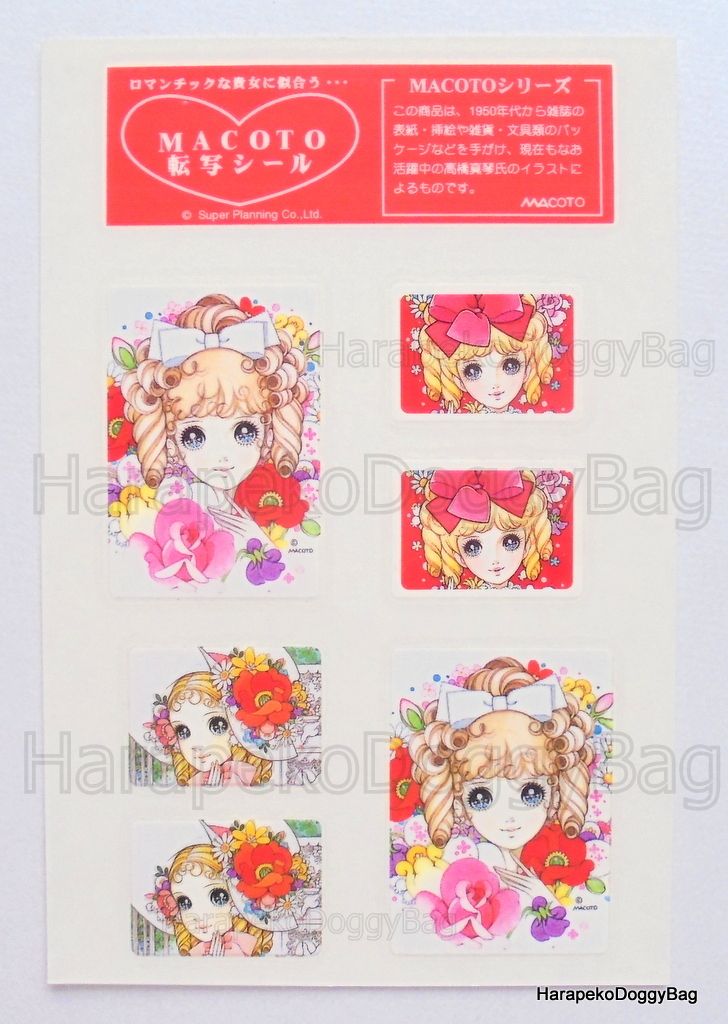 Keywords: Retro, Japanese, Japan, Macoto Takahashi, Makoto, Manga Artist, Kawaii, Cute, Girl, Girly, Shojo, Shoujo, Big Eyes, Sticker Sheet, Stickers, Flowers.