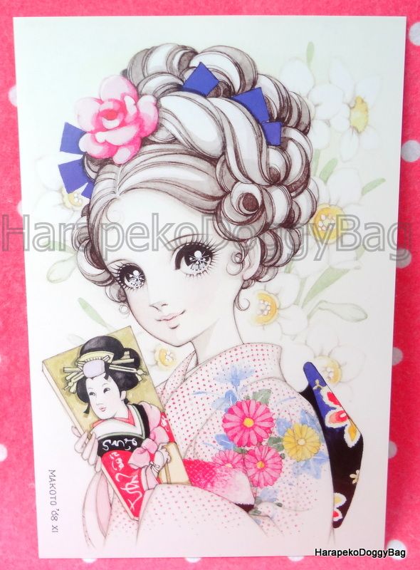 Keywords: Retro, Japanese, Japan, Macoto Takahashi, Makoto, Manga Artist, Kawaii, Cute, Girl, Girly, Shojo, Shoujo, Big Eyes, Postcard, Kimono, 2010.
