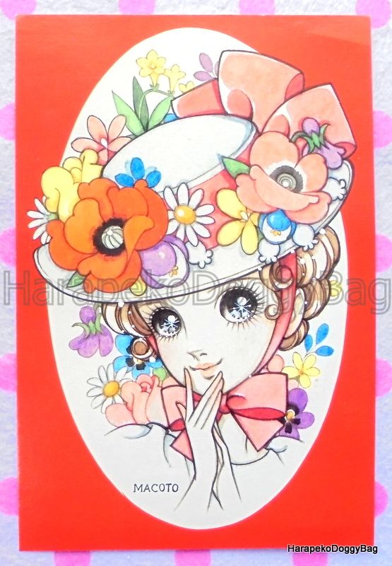 Keywords: Retro, Japanese, Japan, Macoto Takahashi, Makoto, Manga Artist, Kawaii, Cute, Girl, Girly, Shojo, Shoujo, Big Eyes, Flowers, Hat, Postcard, 1998.