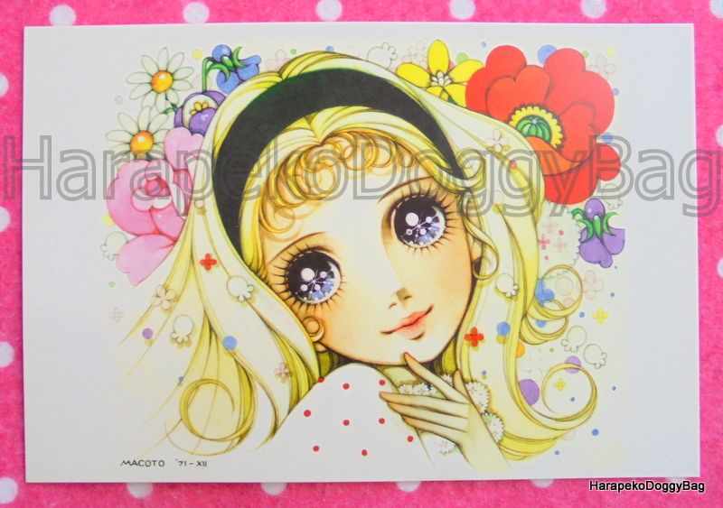 Keywords: Retro, Japanese, Japan, Macoto Takahashi, Makoto, Manga Artist, Kawaii, Cute, Girl, Girly, Shojo, Shoujo, Big Eyes, Postcard, Flowers.