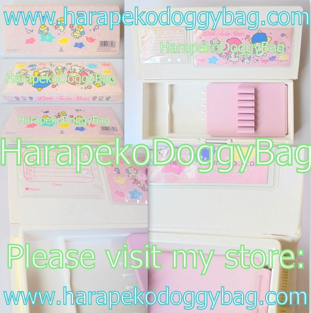 VINTAGE LITTLE TWIN STARS PENCIL CASE CONDITION: The item is from 1986 and is in new and unused condition. Overall, it is in very good condition. The pencil case surface has some dent marks and the color has faded a little and changed due to age. There is some yellowing on the plastic around the edges. The plastic edge on the left and right side where the pencil case lid opens has split.